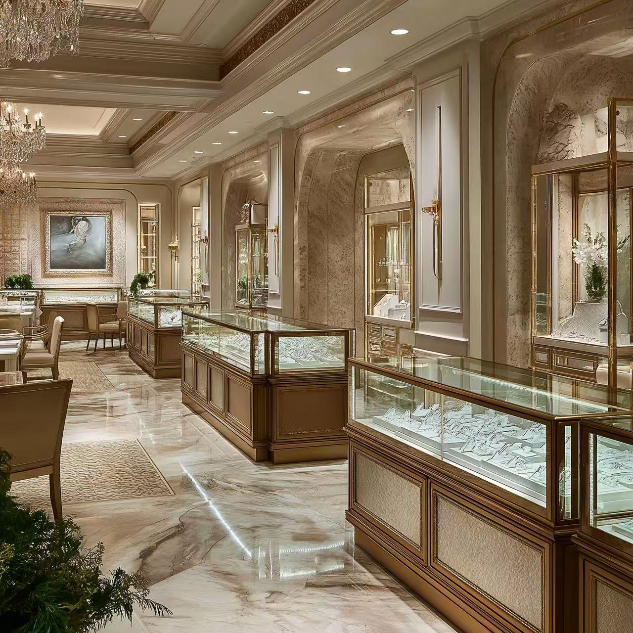 1. 精准的重点照明:每一个展柜都用了嵌入式轨道射灯,精准打在珠宝上,让珠宝在柜里自带“发光buff”,一眼就抓住视线。