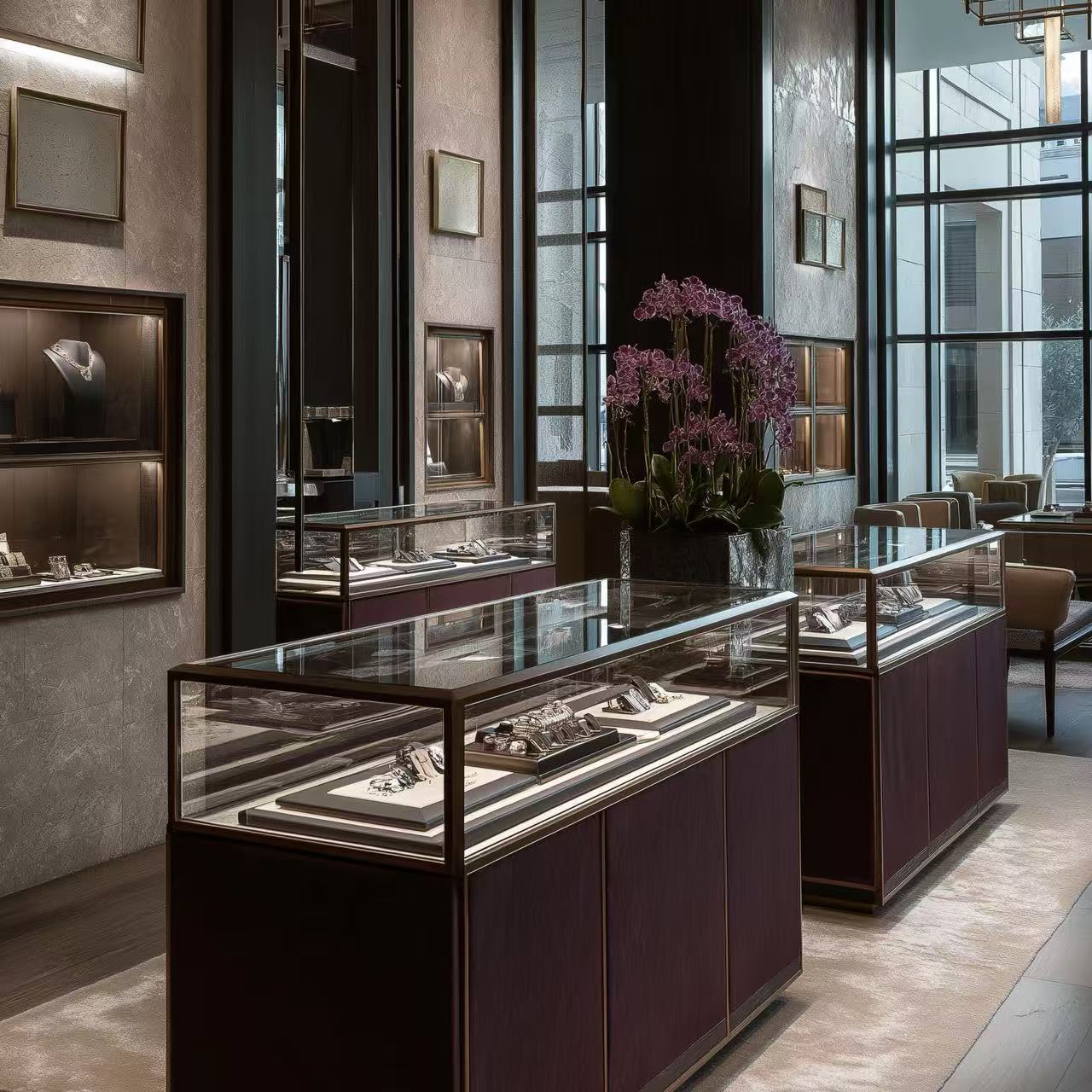 不会把商品塞得满满当当,用深木色立柱+半透玻璃做分区,每一个展柜都成了独立的“艺术品展区”,让整个空间开阔不压抑,逛起来完全没有压迫感。